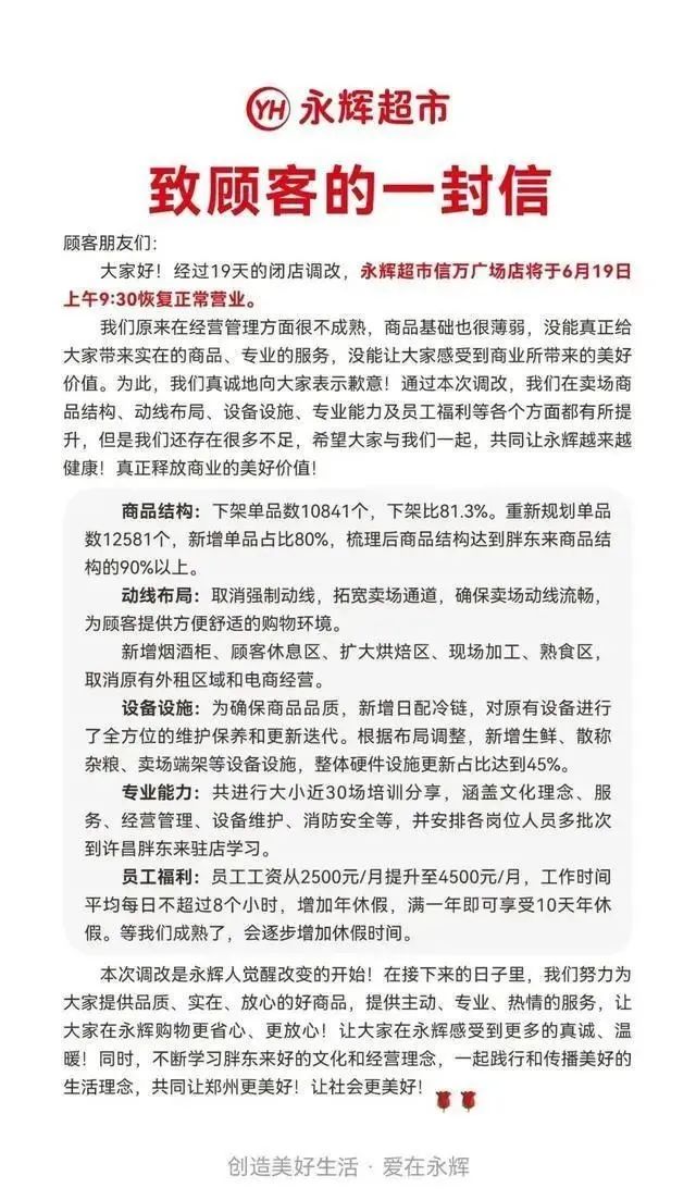 胖東來爆改傳統(tǒng)超市又迎一店。6月19日,經(jīng)過19天的閉店改造,永輝超市鄭州信萬廣場店正式恢復營業(yè)。