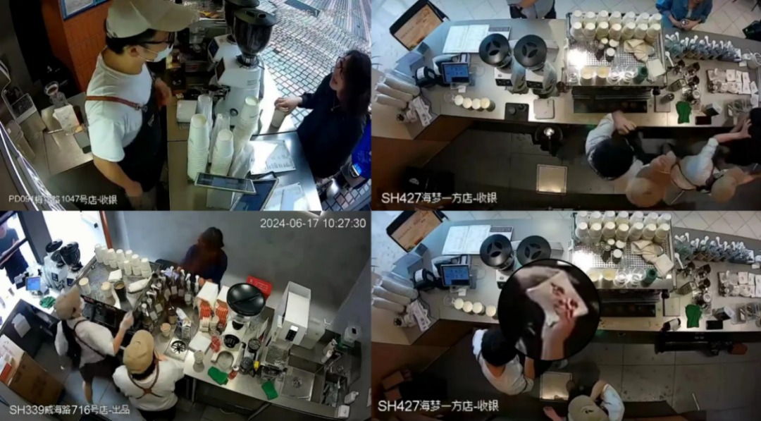 此前流出的三則內(nèi)部監(jiān)控顯示,5月22日,海夢一方店男店員與顧客爆發(fā)激烈肢體沖突;6月17日,梅花路1047號店男店員與女顧客發(fā)生肢體沖突;同日,威海路716號門店女店員向女顧客潑灑咖啡粉。