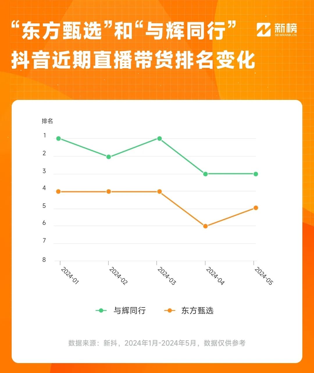 在抖音帶貨月榜中,東方甄選4月銷(xiāo)售額達(dá)到1.9億元,位列帶貨榜第九位,而與輝同行則憑借5.8億元的銷(xiāo)售額強(qiáng)勢(shì)登頂;5月,與輝同行繼續(xù)以5.33億元的銷(xiāo)售額穩(wěn)居第二,而東方甄選雖然有所回升,但仍僅排名第六。