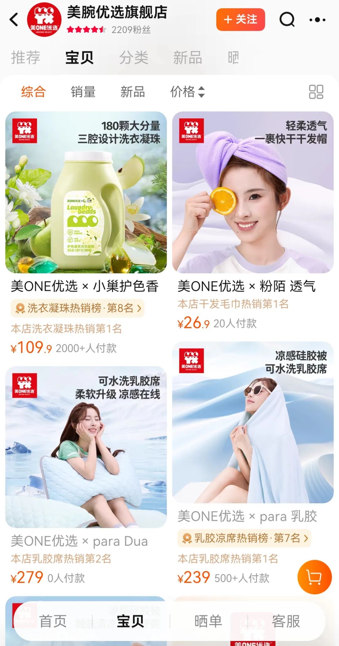 目前,美腕優(yōu)選旗艦店內(nèi)共有5款商品,包括洗衣凝珠、干發(fā)帽、乳膠席、硅膠被等5款產(chǎn)品,店鋪粉絲2009人。