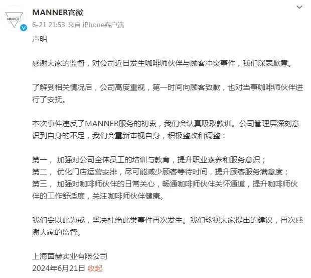 事后,根據(jù)來自Manner總部的消息,潑咖啡粉的店員已被辭退,而打人的男店員則向女顧客道歉。6月21日,Manner官方微博就近日發(fā)生咖啡師伙伴與顧客沖突事件發(fā)布聲明,公開致歉。