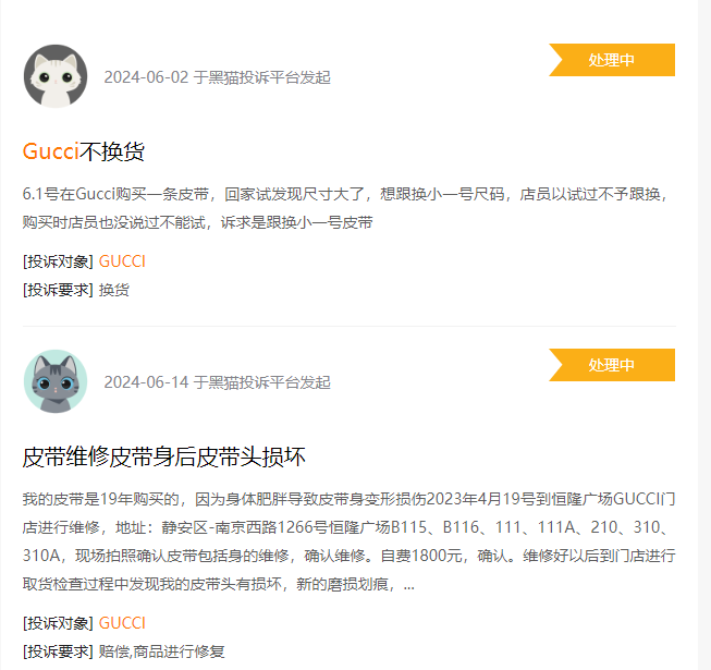 但開云集團(tuán)在中國市場的銷售培訓(xùn)明顯不夠,甚至可以說是缺乏同理心。在黑貓投訴上,有消費(fèi)者投訴稱,在GUCCI線下門店購買的皮帶尺寸不合適,門店不進(jìn)行換貨。皮帶維修后出現(xiàn)質(zhì)量問題,不進(jìn)行維修。