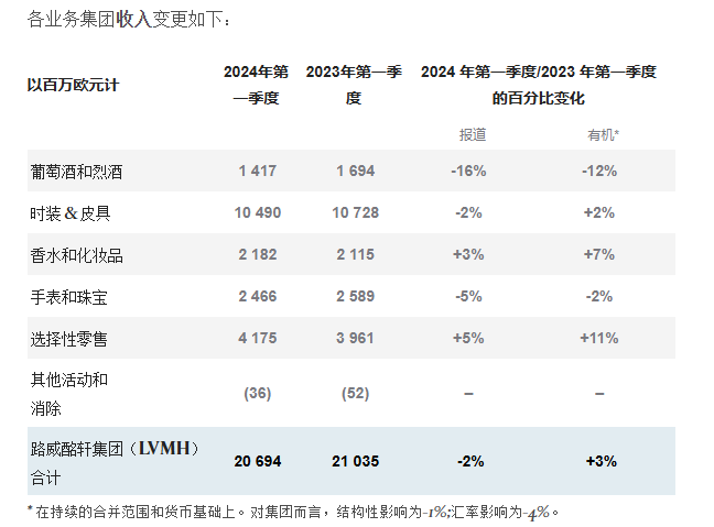 LV旗下軒尼詩干邑白蘭地受美國謹(jǐn)慎補(bǔ)貨和中國農(nóng)歷新年期間需求疲軟影響,2024年Q1葡萄酒和烈酒有機(jī)營收暴跌12%,成為LV業(yè)績下滑最嚴(yán)重的業(yè)務(wù),直接拖累LV該季度業(yè)績增長。