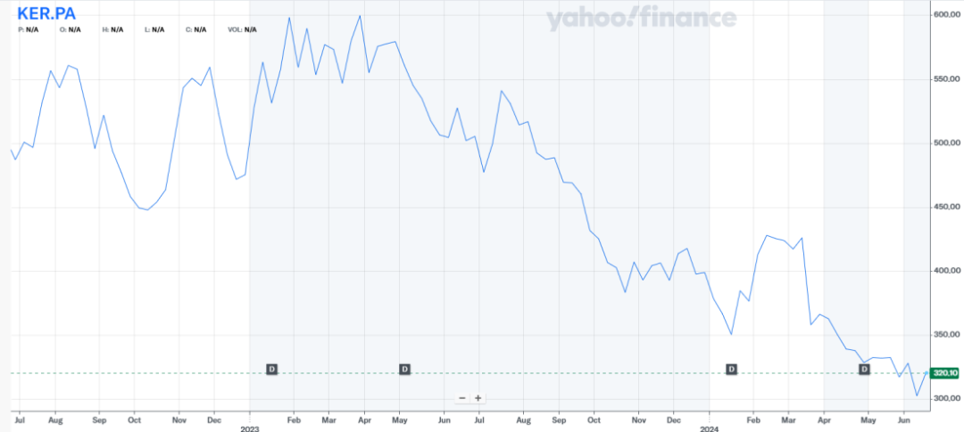 業(yè)績持續(xù)惡化,開云集團(tuán)股價(jià)從2023年7月527美元/股狂跌至今年的320.1美元/股,跌幅比例近40%。拉長時間線來看,近兩年開云集團(tuán)股價(jià)一直處在下行區(qū)間。