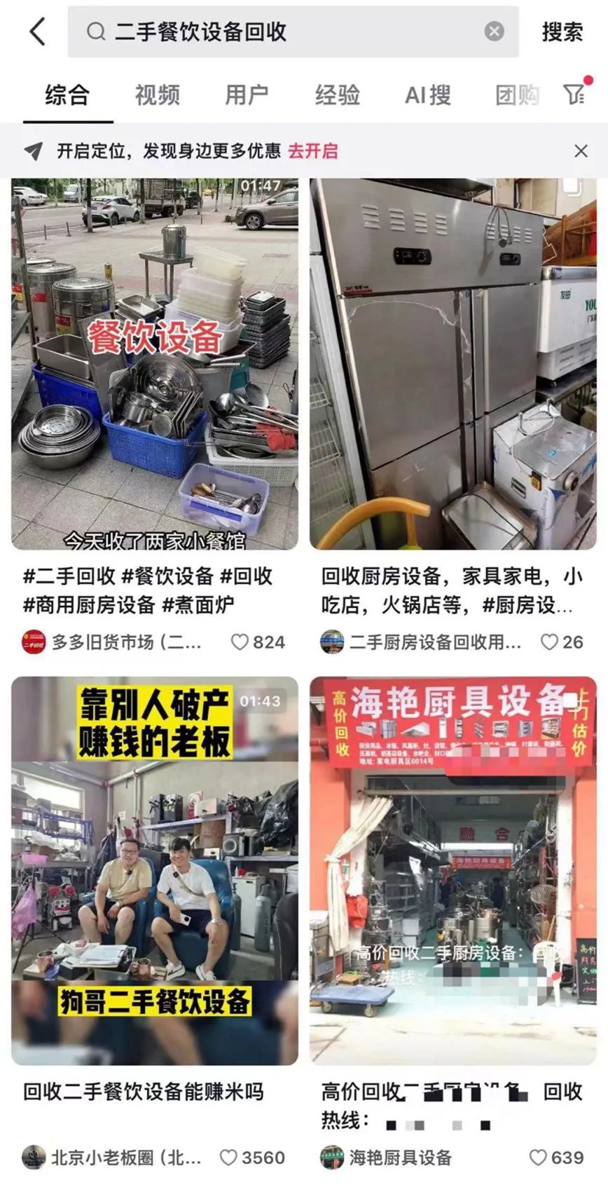 在抖音平臺搜索相關(guān)關(guān)鍵詞,能看到大量賬號在發(fā)布相關(guān)的內(nèi)容,大量9成新的餐飲設(shè)備被兩折甚至一折的價格收購,然后重新流入市場、待價而沽。據(jù)《第一財經(jīng)》報道中的從業(yè)者透露,其回收設(shè)備的毛利率達60%。