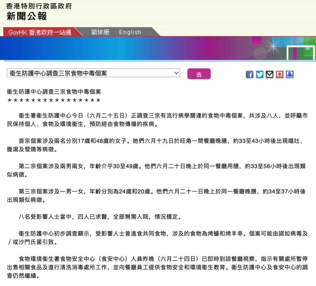 6月25日,中國香港衛(wèi)生署衛(wèi)生防護中心通告:6月19日,2名顧客在香港旺角一家餐廳就餐后,約33至43小時后出現(xiàn)嘔吐、腹瀉及發(fā)燒等病征;6月20日,4名顧客在同一餐廳就餐后,約33至56小時后出現(xiàn)類似病征;6月21日,又有2名顧客在同一餐廳吃晚餐,約34至37小時后出現(xiàn)類似病征。其中4人已經求醫(yī),全部無需入院,情況穩(wěn)定。