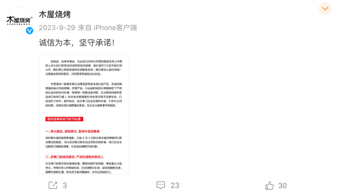 然而道歉還不到一年,木屋燒烤如今又發(fā)生食品安全事件。