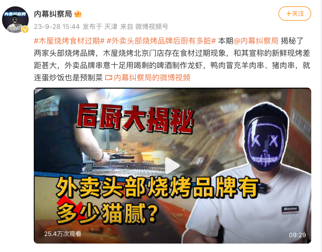 去年9月,有自媒體發(fā)視頻稱“木屋燒烤北京門店存在食材過期現(xiàn)象,和其宣稱的新鮮現(xiàn)烤差距甚大”。