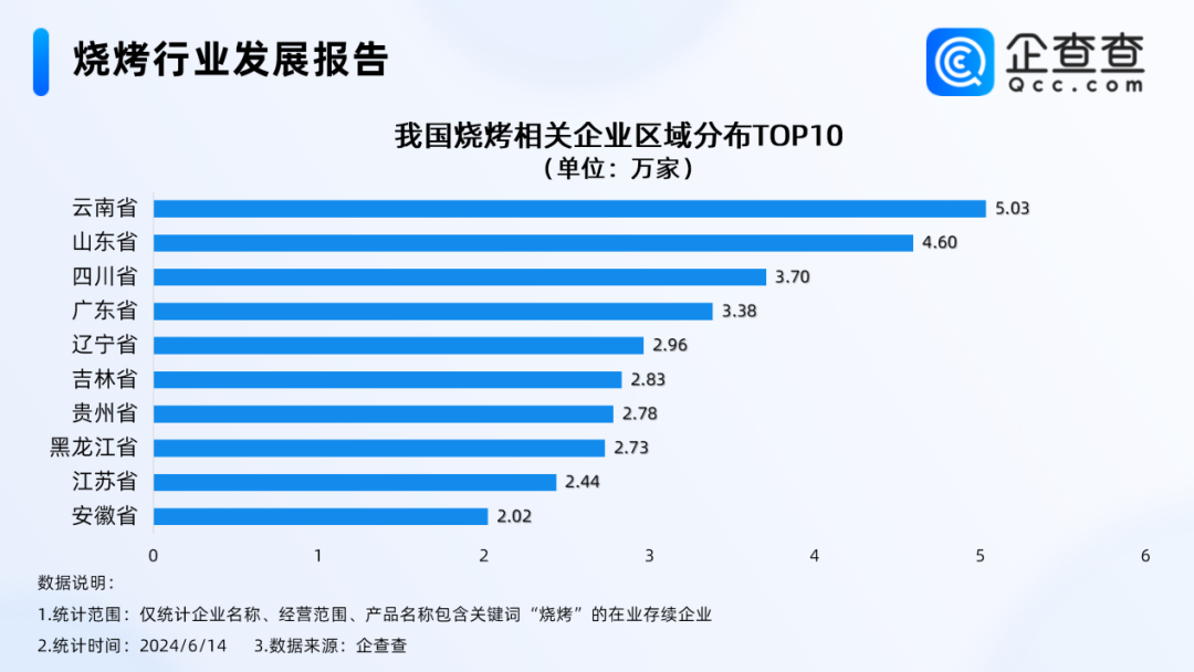 得益于強大的消費群體,各地的燒烤企業(yè)不斷增長。企查查數(shù)據(jù)顯示,2023年我國燒烤相關企業(yè)注冊量同比增加23.9%,至12.33萬家,創(chuàng)近十年新高。區(qū)域分布上,云南相關企業(yè)存量最多,有5.03萬家,其次是山東現(xiàn)存4.6萬家,此后依次為四川、廣東、遼寧等地。