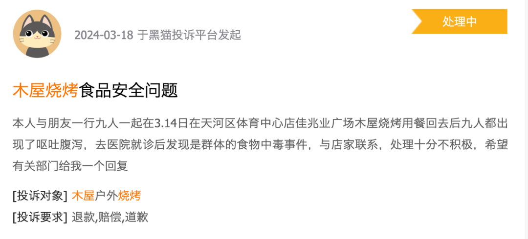 還有消費者稱,“本人與朋友一行九人一起在3.14日在天河區(qū)體育中心店佳兆業(yè)廣場木屋燒烤用餐回去后九人都出現(xiàn)了嘔吐腹瀉,去醫(yī)院就診后發(fā)現(xiàn)是群體的食物中毒事件,與店家聯(lián)系,處理十分不積極,希望有關部門給我一個回復!
