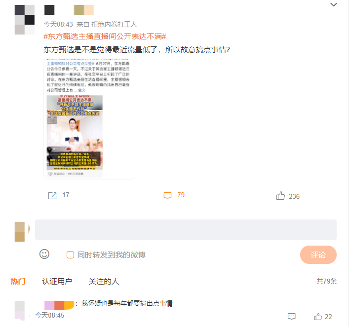 有網(wǎng)友懷疑,頓頓有此行為是不是想自立門戶了?也有不少網(wǎng)友表示,東方甄選是不是最近流量不好,所以故意搞點事情?還有網(wǎng)友稱,自從董宇輝走后,就對東方甄選祛魅了。