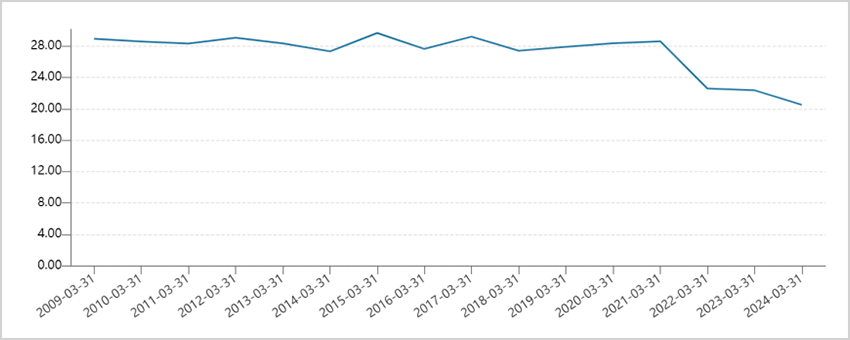 再看周大福盈利能力,亦出現(xiàn)較為明顯的惡化。2024財年,周大福銷售毛利率為20.5%,同比下滑近2%,較2021財年更是下滑超8%,創(chuàng)下2009財年有財務(wù)數(shù)據(jù)披露以來最低。