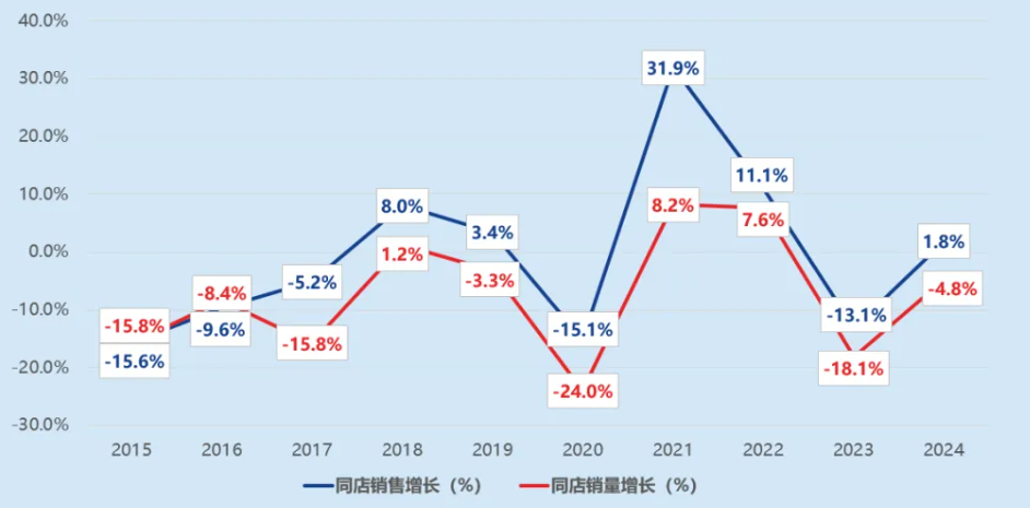 2015財年-2024財年內(nèi)地市場同店銷售表現(xiàn);來源:新浪財經(jīng)