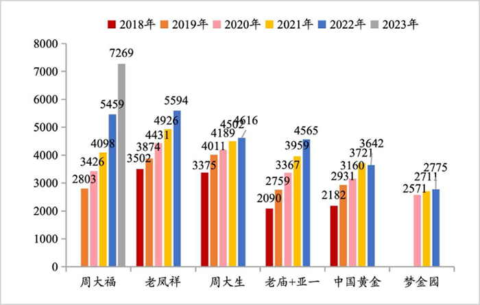 2018-2023年,市場TOP5占有率從18.6%持續(xù)攀升至29.5%。尤其是疫情三年,不少中小珠寶商倒閉,加劇了市場“大魚吃小魚”的現(xiàn)狀。