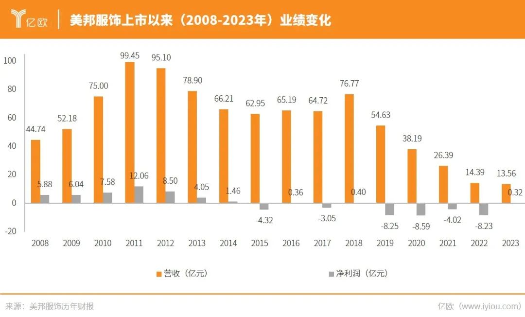 2012年開始,美邦服飾的業(yè)績接連下滑。營收從2012年的95.10億元下降到2013的78.90億元,2014年又降到66.21億元;凈利潤更是直接腰斬,從2012年的8.50億元跌落至2013年的4.05億元,2014年又降到1.46億元,2015年更是虧損4.32億元,出現(xiàn)上市以來首次虧損。