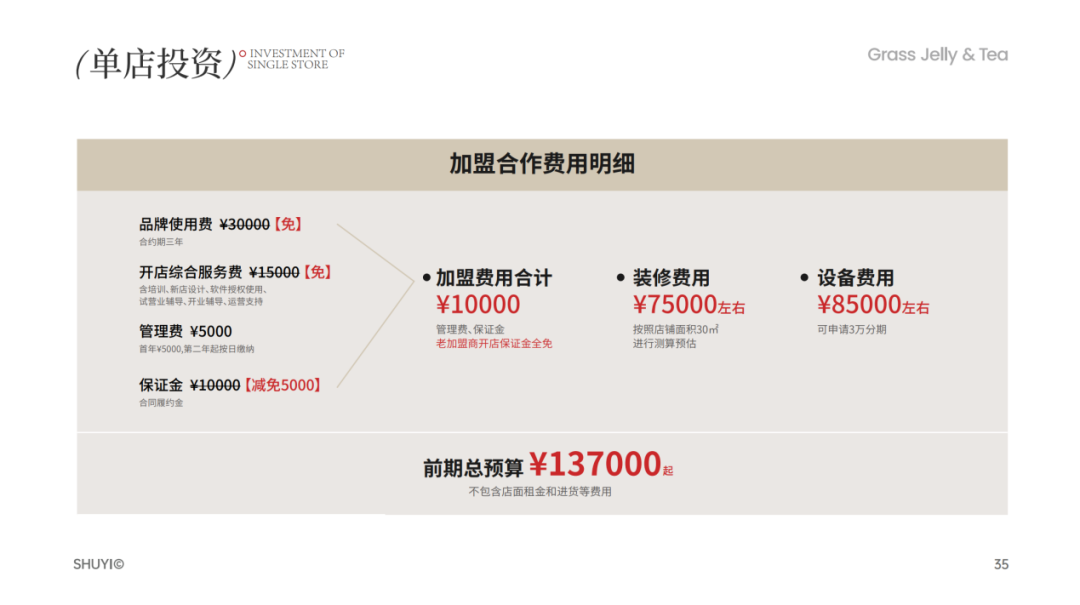 2024年開年,書亦宣布「開店費用全免」活動,3萬元的品牌使用費、開店綜合服務(wù)費1.5萬、保證金減免5000。合計加盟費用1萬元,加上裝修費用7.5萬、設(shè)備費用8萬5,總預(yù)算為13萬。