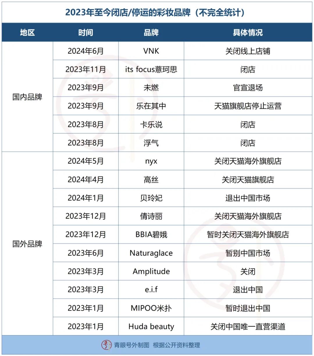 據(jù)青眼號外不完全梳理,自2023年至今,至少有浮氣、樂在其中、薏珂思等6個國內(nèi)彩妝品牌相繼關(guān)停,有NYX、貝玲妃、倩詩麗等10個國外彩妝品牌閉店或者撤出中國市場,其中還不乏一些曾在市場上創(chuàng)造過良好業(yè)績并具有較高知名度的品牌。