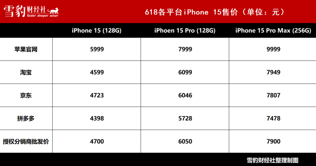 三線城市手機(jī)零售商劉浩(化名)6月6日拿到的官方分銷渠道批發(fā)報(bào)價(jià)單上,128G的iPhone 15和iPhone 15 Pro,進(jìn)貨價(jià)分別是4700元、6050元。“通常會在進(jìn)貨價(jià)的基礎(chǔ)上加價(jià)一到兩張(100~200元)來賣!眲⒑聘嬖V雪豹財(cái)經(jīng)社。