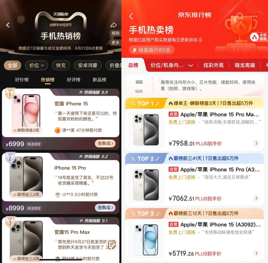 IDC數(shù)據(jù)顯示,2023年Q4和全年,iPhone出貨量在國內(nèi)市場均排在首位,市場份額分別為20%、17.3%。在今年淘寶、京東公布的618手機(jī)銷售榜上,iPhone 15、iPhone 15 Pro和iPhone 15 Pro Max三款機(jī)型,毫無懸念地霸榜前三。