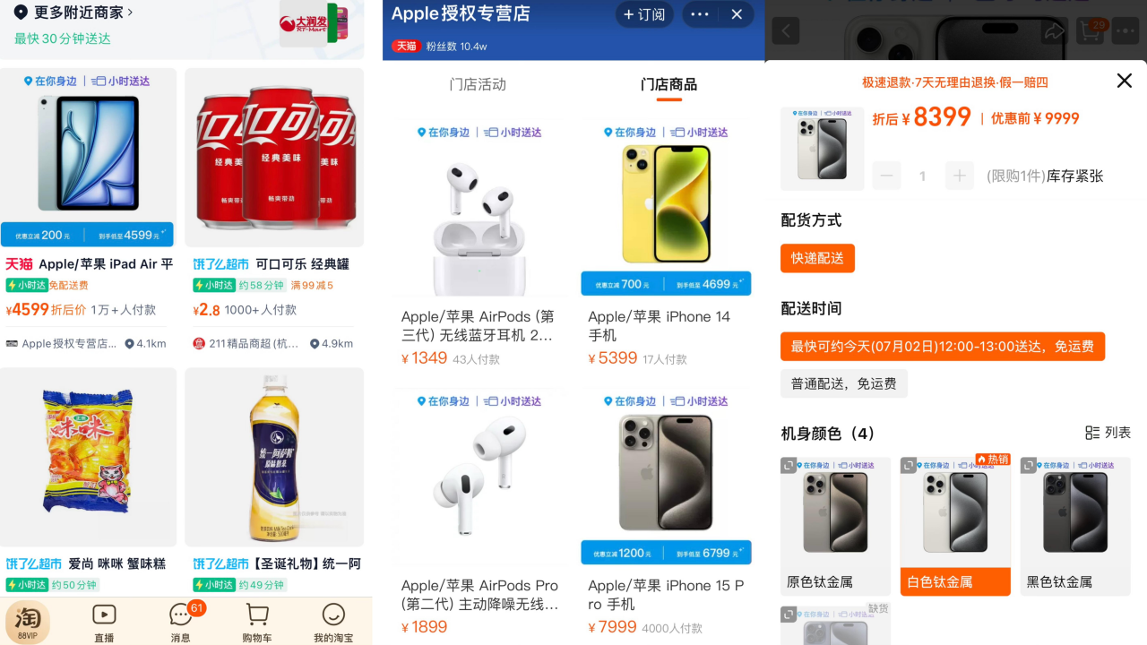 以一家天貓Apple授權(quán)專營店為例,用戶在小時達(dá)頻道看到商品點擊進(jìn)入后,會跳轉(zhuǎn)到天貓店鋪,而下單時可以選擇普通配送或者小時達(dá)配送。