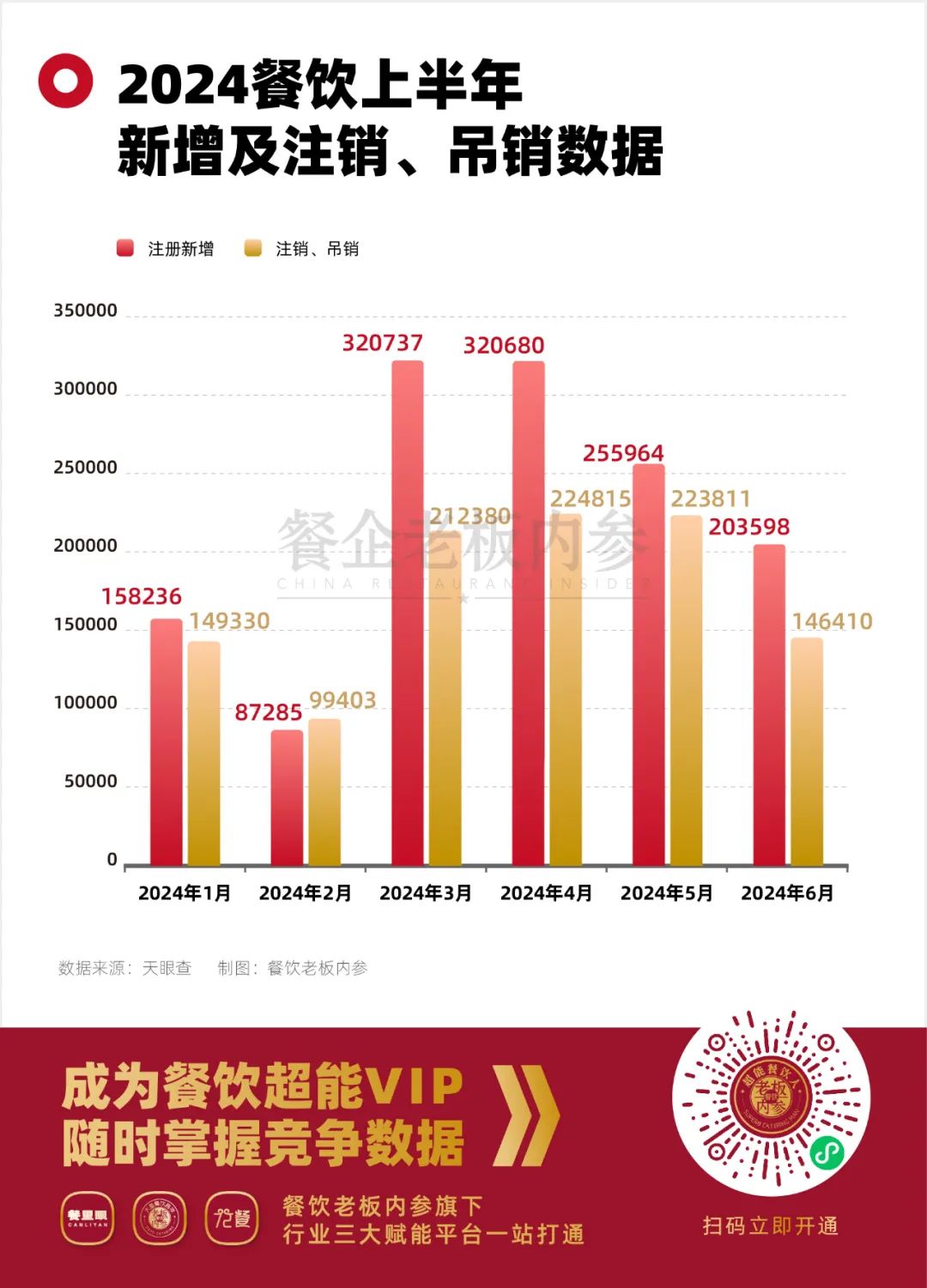 天眼查數(shù)據(jù)顯示,截至2024年6月30日,國內(nèi)餐飲相關(guān)企業(yè)新注冊量達到134.6萬家,而注銷、吊銷量也達到驚人的105.6萬家(吊銷:10471家、注銷:1045678家)。而今年一季度結(jié)束時,內(nèi)參君曾總結(jié)“46萬家餐廳注銷吊銷”,也就是說,僅僅第二季度3個月,倒下的餐飲居然有60萬家左右…