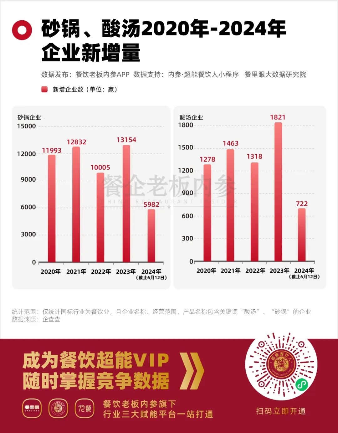 天眼查顯示,截至2024年6月中旬,全國新增“酸湯”相關(guān)企業(yè)僅為722家,而這個數(shù)據(jù),2020-2023全年,分別是1278(2020年)、1463(2021年)、1318(2022年)、1821(2023年)。也就是說,除了2023年有小規(guī)模的“增長”之外,今年上半年的酸湯生意,依然是“平靜如湖水”。