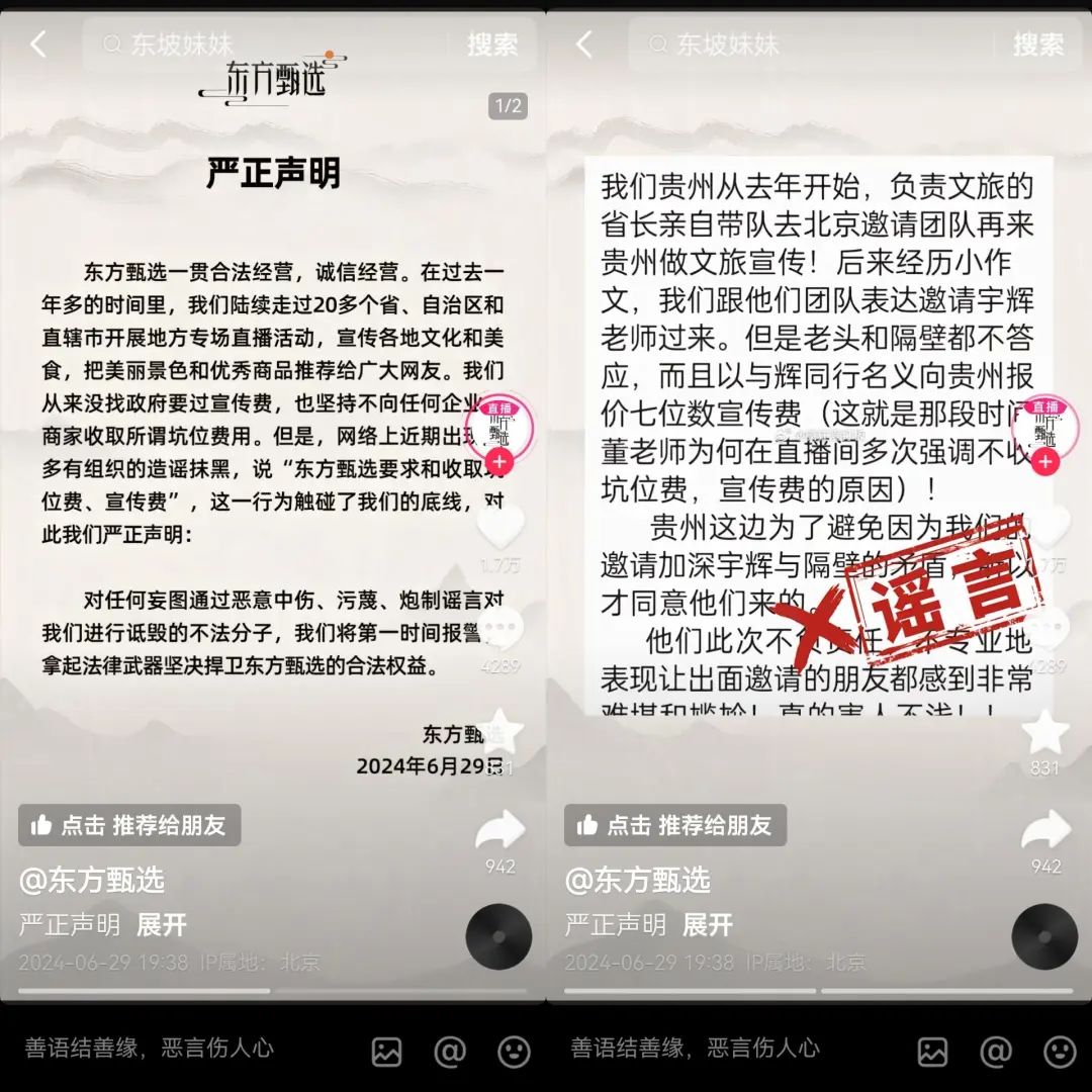 面對這些爭議,東方甄選進(jìn)行了冷處理,卻在6月29日出乎意料地發(fā)出一則聲明,表示東方甄選從未收取過坑位費、宣傳費,并且附上謠言全文:貴州文旅想邀請董宇輝“老師”,但被打著董宇輝旗號的東方甄選“老頭”收了宣傳費。俞敏洪也在個人抖音賬號上表示,“不接受造謠和誹謗”。