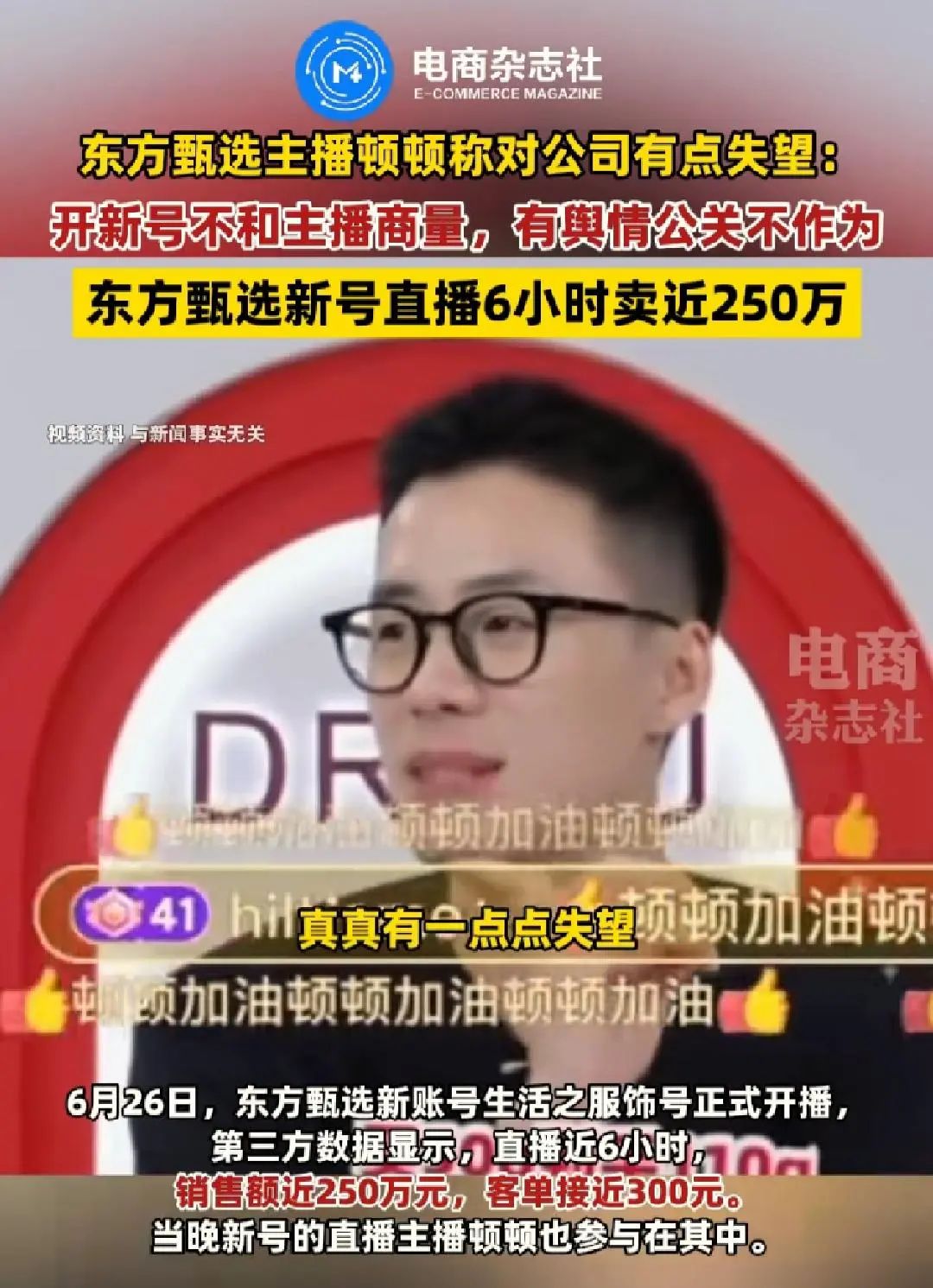 這次把“內(nèi)部矛盾”暴露在眾人面前的,是東方甄選的頭部主播頓頓。平時總是以笑臉示人的他,在直播間嚴(yán)肅地表示對公司有點失望,認(rèn)為管理層忽略了主播的感受,公關(guān)部門不保護(hù)主播。