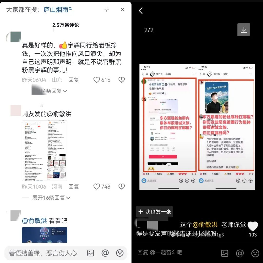 謠言中,東方甄選和董宇輝形成了對立,而辟謠聲明中東方甄選將近期的負(fù)面爭議稱為“有組織的造謠抹黑”,讓眾多董宇輝的“丈母娘”感到不滿。她們聚集在俞敏洪的抖音賬號評論區(qū),發(fā)出截圖質(zhì)疑東方甄選粉絲在惡意針對董宇輝,喊話俞敏洪要“一碗水端平”。