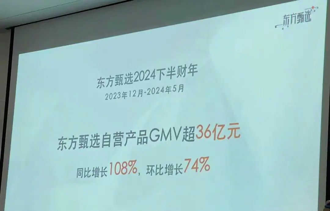 6月19日,東方甄選透露,2024下半財年(2023年12月至2024年5月),東方甄選公司自營產(chǎn)品GMV突破36億元,同比增長108%,環(huán)比增長74%。