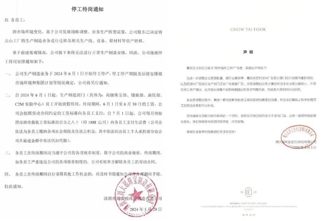 近日,社交媒體上還有博主爆料,周大福深圳工廠停工停產(chǎn)。網(wǎng)友發(fā)布的通知截圖顯示,因市場環(huán)境變化,基于公司發(fā)展戰(zhàn)略調(diào)整,業(yè)務(wù)生產(chǎn)轉(zhuǎn)型需要,公司生產(chǎn)制造業(yè)務(wù)于2024年6月1日開始停工停產(chǎn),停工停產(chǎn)期限及后續(xù)安排視市場環(huán)境和集團計劃等情況確定。