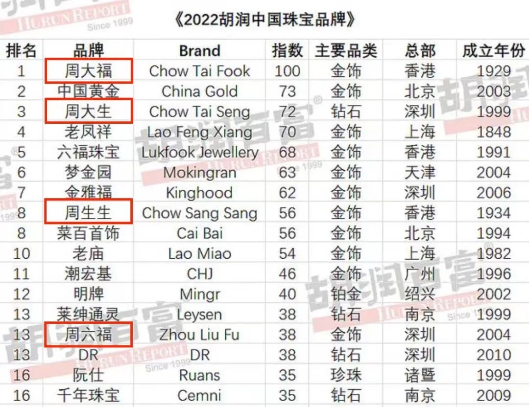 在《2022胡潤中國珠寶品牌榜》上,“周氏”珠寶中的周大福,位居中國珠寶品牌第一名;隨后的周大生、周生生、周六福品牌也名列前20,周金生、周大金則進入50強。