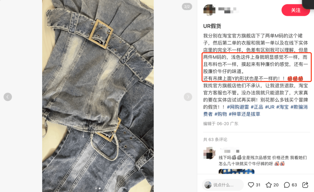 在社交媒體上,還有很多關于吐槽UR衣服質(zhì)量“以次充好”、品控不嚴,甚至是在官方旗艦店買到“假貨”的帖子。