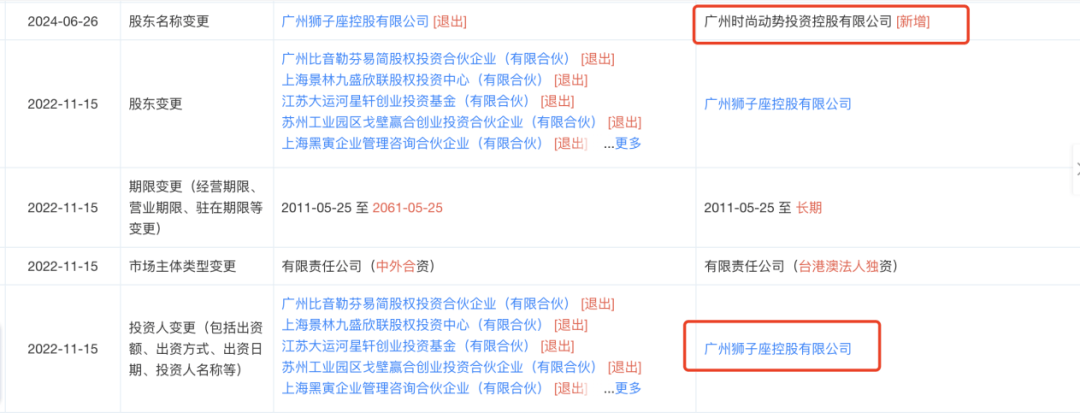 2022年11月,數(shù)名股東集體退出了快尚時裝,由原先多股東持股模式轉變?yōu)閱我还蓶|全資控股,調(diào)整完成后廣州獅子座控股有限公司持有快尚時裝100%的股份。