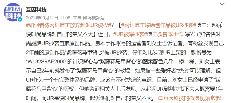 2022年,UR曾深陷“抄襲”事件,因UR當季熱賣款與多位小眾設計師相撞而在社交媒體平臺上惹來爭議。