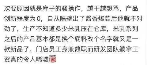 有庫迪門店員工在小紅書上爆料:“產品創(chuàng)新程度為0,生產不知道多少米乳壓在倉庫,米乳系列之后的產品基本都是換個底料改個名字就又是一款新品了”,還發(fā)出了“門店員工身兼數(shù)職,而研發(fā)團隊躺拿工資真的令人唏噓”的感慨。