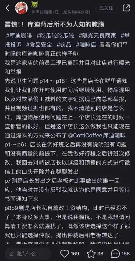 有庫迪前員工在小紅書發(fā)帖揭露其所在門店的多個問題,包括但不限于:在物料開封過了使用效期后繼續(xù)使用、物品混用、對飲品偷工減料等。