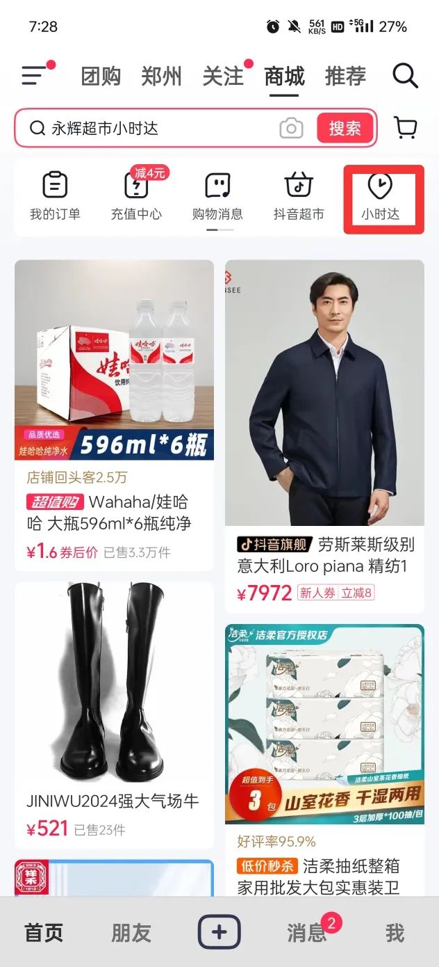 抖音更是早在2023年就升級(jí)了其電商旗下小時(shí)達(dá)業(yè)務(wù)的權(quán)重,為“小時(shí)達(dá)”業(yè)務(wù)上線獨(dú)立入口,用戶(hù)可以在抖音搜索欄內(nèi)搜索“小時(shí)達(dá)”直接觸達(dá),也可以通過(guò)抖音首頁(yè)的“商城”界面進(jìn)入“小時(shí)達(dá)”業(yè)務(wù)。