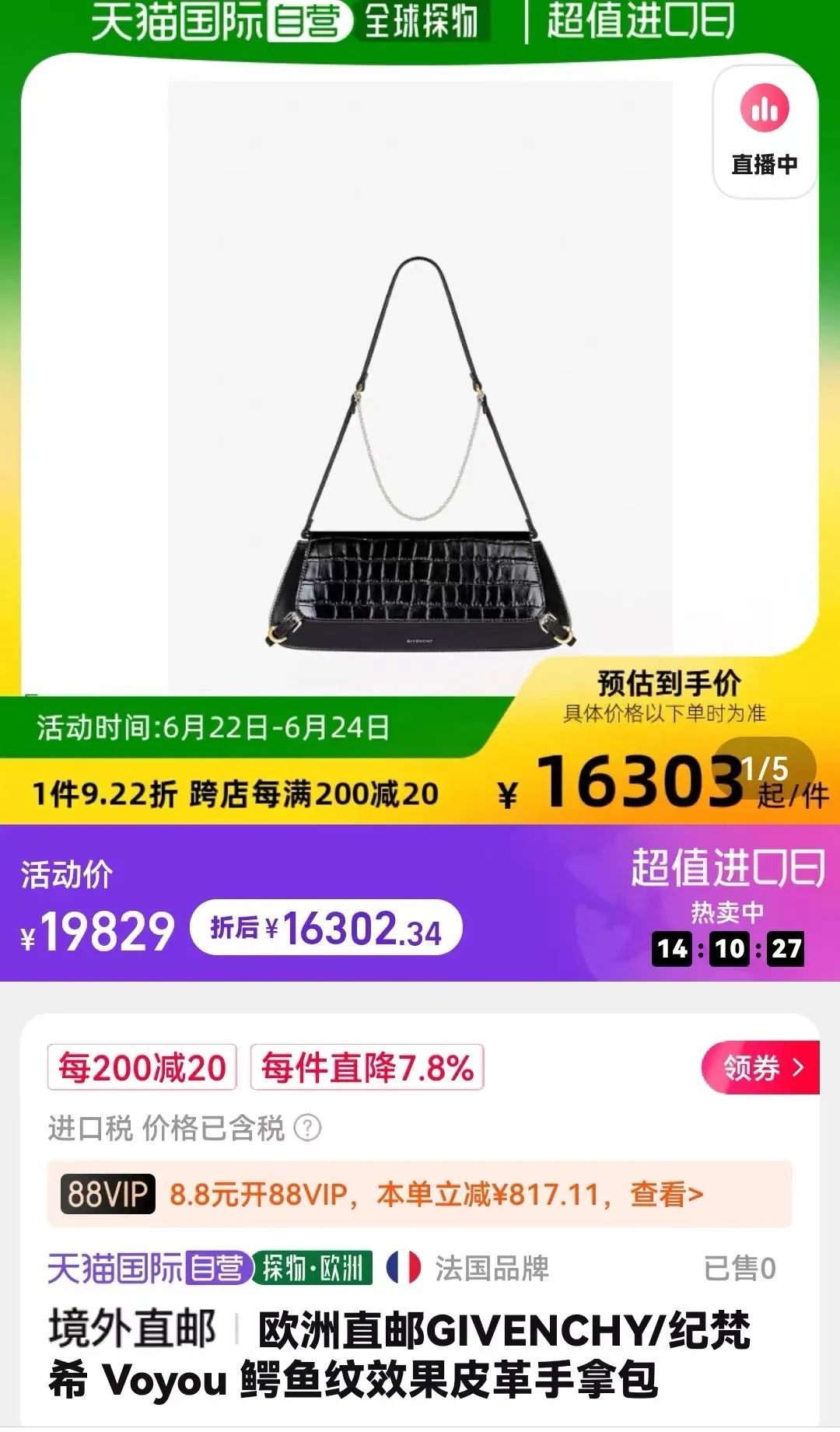 巴黎世家的鱷魚紋沙漏包,原價(jià)高達(dá)17200元,然而在天貓國際官方旗艦店中的售價(jià)僅為10899元,接近六折。同樣引人注目的還有范思哲的鱷魚紋小號手袋,原價(jià)22400元,但預(yù)估到手價(jià)僅為16300元,省了6000元。整體而言,這些產(chǎn)品的平均折扣幅度大約在五折到七折區(qū)間。而且購買部分商品時(shí),顧客還可以享受12期或24期的免息支付服務(wù),這一優(yōu)惠力度確實(shí)是前所未有的。