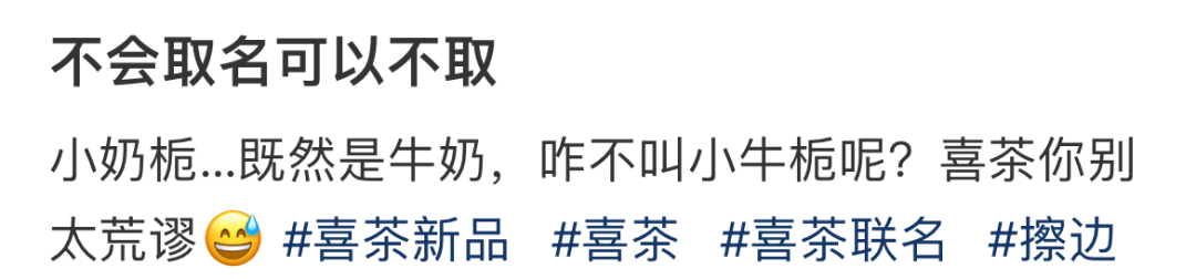 隨后,話題#喜茶新品名小奶梔被指擦邊#也沖上微博熱搜。