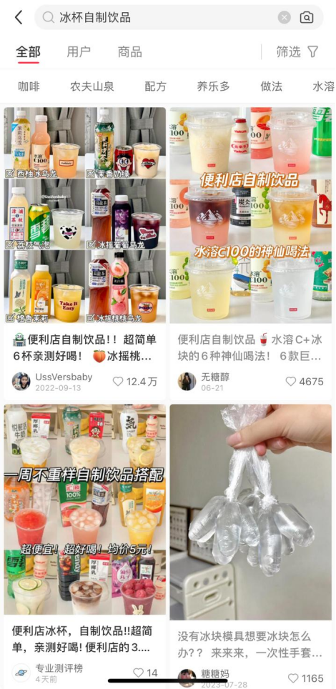 冰杯,年輕在小紅書上搜索“冰杯”,有4萬+的筆記。在“冰杯自制飲品”詞條下,小紅書還貼心的給出了“咖啡”“農(nóng)夫山泉”“養(yǎng)樂多”“葡萄”“氣泡水”等等十幾個選項(xiàng),讓這些“神仙喝法”“親測好喝”的方法精準(zhǔn)呈現(xiàn),足見這個話題的火爆程度。