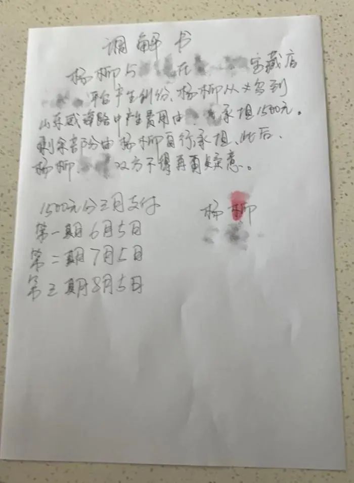 經(jīng)過漫長的交涉和派出所民警介入,雙方終于簽下調(diào)解書,對方同意分期支付1500元。雖然沒能彌補(bǔ)楊先生路途中產(chǎn)生的成本,但也算有了個可以接受的結(jié)果。