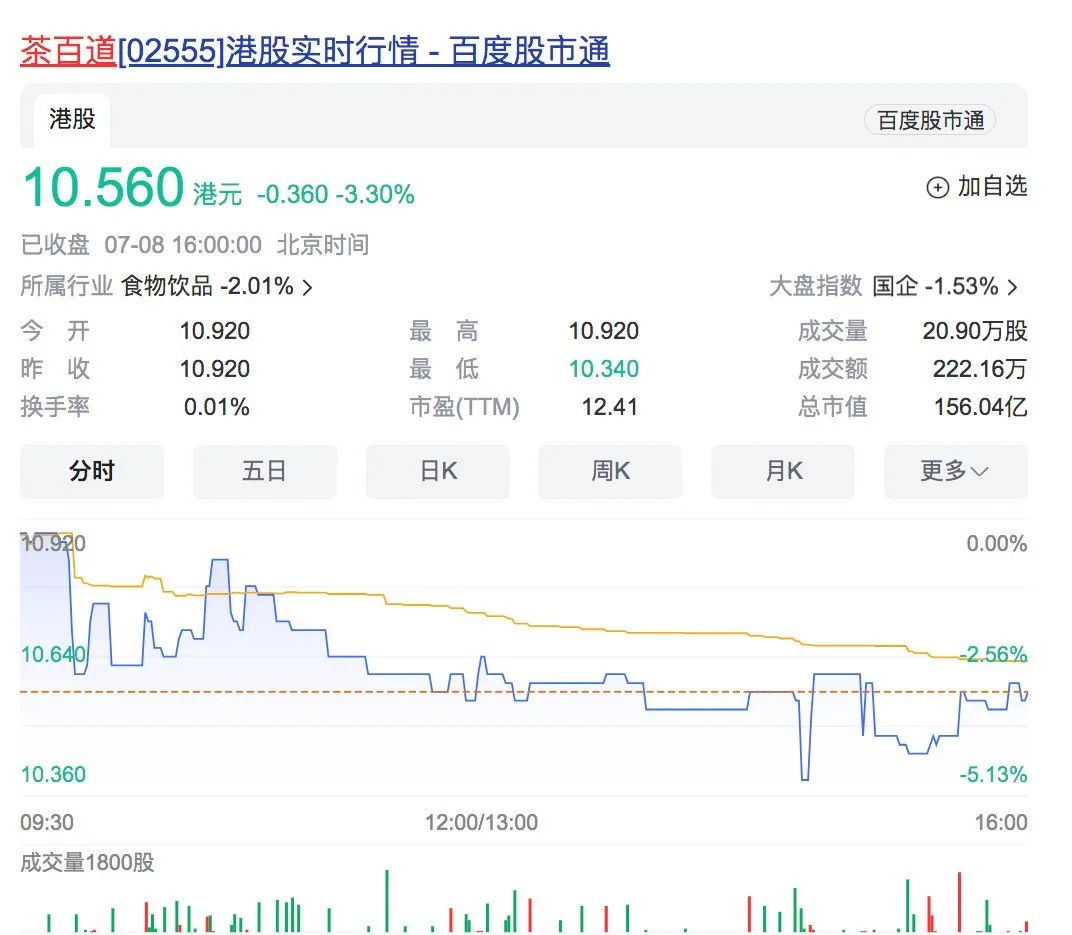 但與奈雪的茶相似,茶百道也未能避免上市首日破發(fā)的命運:茶百道股票發(fā)行價為17.5港元/股,開盤為15.74港元,低開10.06%,首日最大跌幅38.29%,收盤12.8港元,收跌26.86%,上市首日茶百道市值蒸發(fā)約70億元。截止7月8日收盤10.6港元/股,已跌去近40%。