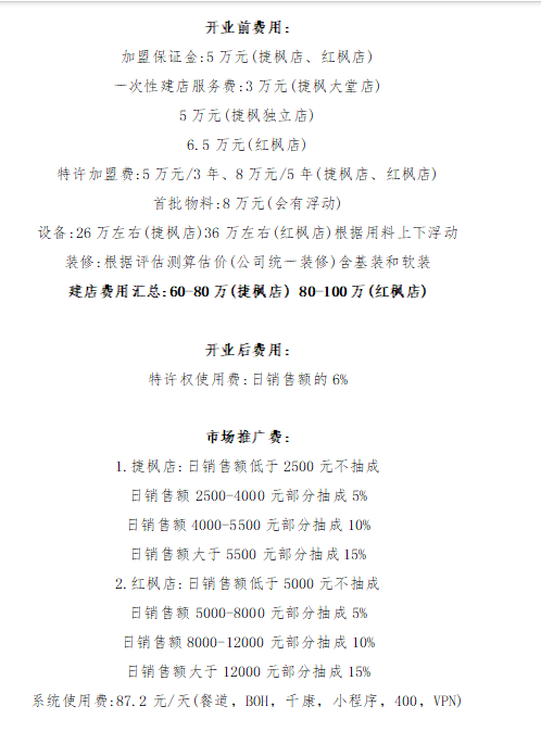 李麗提供給時(shí)代周報(bào)的加盟文件顯示,標(biāo)準(zhǔn)典型紅楓店的建店總費(fèi)用為80萬(wàn)元-100萬(wàn)元,小面積的捷楓店的建店總費(fèi)用在60萬(wàn)元-80萬(wàn)元,開(kāi)業(yè)后還將收取特許權(quán)使用費(fèi)(日銷(xiāo)售額的6%)以及市場(chǎng)推廣費(fèi)等費(fèi)用。