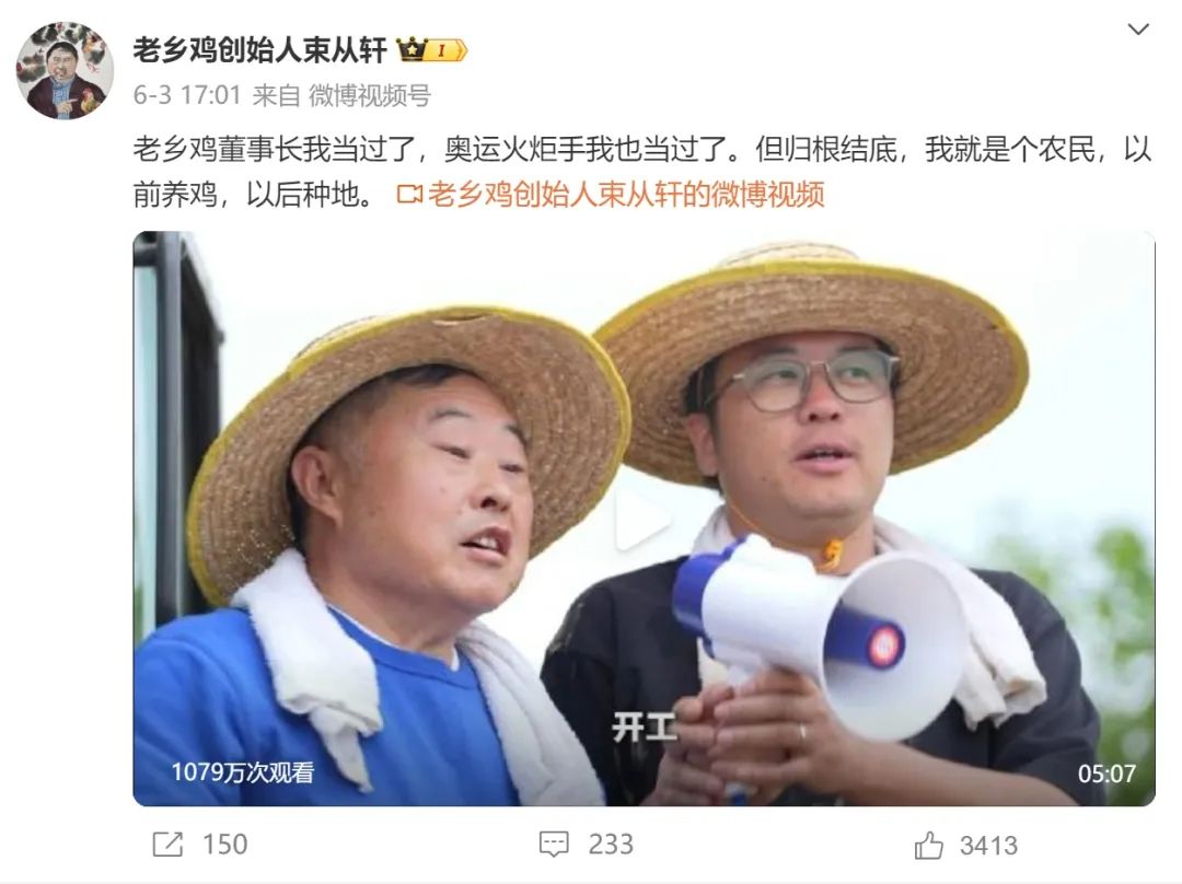 完成巴黎奧運(yùn)會(huì)火炬?zhèn)鬟f后第二天,老鄉(xiāng)雞創(chuàng)始人束從軒,出現(xiàn)在老鄉(xiāng)雞農(nóng)場(chǎng)開(kāi)工現(xiàn)場(chǎng)。頭戴草帽、身著湛藍(lán)色短袖、褲腳綰到膝蓋下、肩扛鋤頭,一副老農(nóng)民的裝扮。