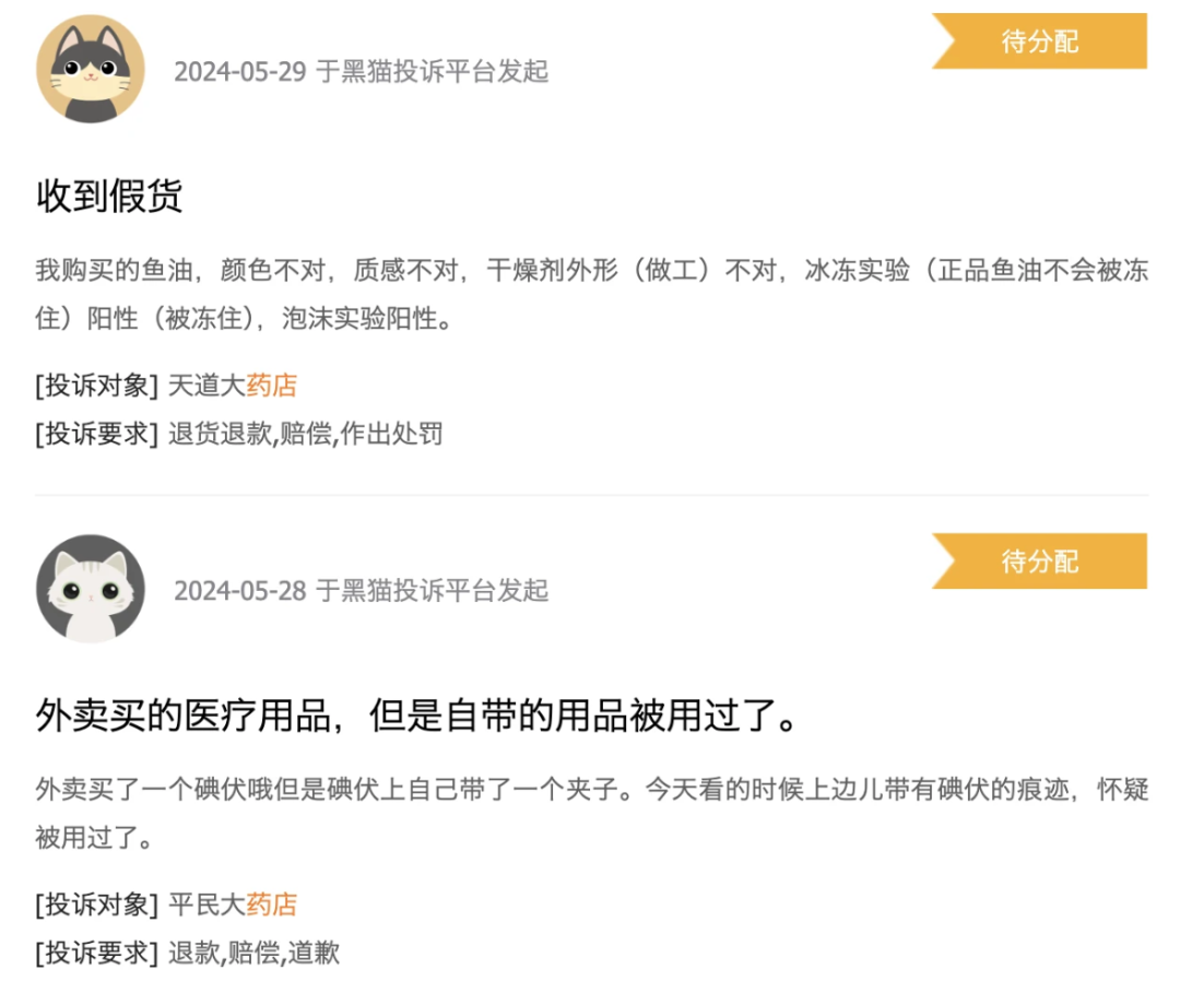 此外,也有網(wǎng)友表示收到的藥品存在質(zhì)量問題。比如在黑貓投訴上,有用戶表示,“我購買的魚油,顏色不對,質(zhì)感不對,干燥劑外形(做工)不對,冰凍實驗(正品魚油不會被凍。╆栃裕ū粌鲎。,泡沫實驗陽性!币灿杏脩糍徺I的醫(yī)療產(chǎn)品并非新產(chǎn)品,而是被使用過的。