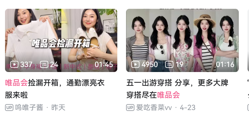 當(dāng)然,除了官方賬號(hào)下場(chǎng)造梗玩梗之外,更多UP主也開(kāi)始分享唯品會(huì)的好物、穿搭,“挖寶” “大牌撿漏”也成為了這類視頻的高頻詞。未來(lái)也許會(huì)看到唯品會(huì)與B站不同物種之間的化學(xué)反應(yīng)能創(chuàng)造出更多另類多樣的內(nèi)容營(yíng)銷途徑。