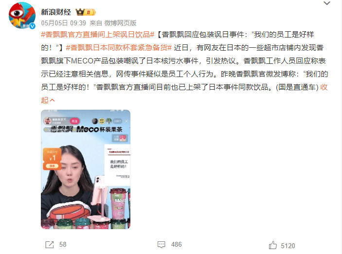 今年上半年,香飄飄經(jīng)歷了最大的輿論風(fēng)波之一,其銷售額迎來大起大落,口碑也經(jīng)歷了反轉(zhuǎn)。起因是有網(wǎng)友在日本的華人超市發(fā)現(xiàn),香飄飄旗下的Meco 果茶的杯套上,印有嘲諷日本核污水的文字。隨著該事件系香飄飄內(nèi)部員工個(gè)人行為、香飄飄力挺員工、董事長蔣建琪親自接機(jī)歸國員工等后續(xù)傳來,不少網(wǎng)友在網(wǎng)上大贊香飄飄,并將這股熱情帶到了香飄飄的旗艦店。據(jù)媒體報(bào)道,那幾天,香飄飄多個(gè)電商平臺(tái)賣斷貨,其抖音旗艦店單日銷售額最高超百萬元。同時(shí),其股價(jià)也創(chuàng)下了2023年7月以來新高。