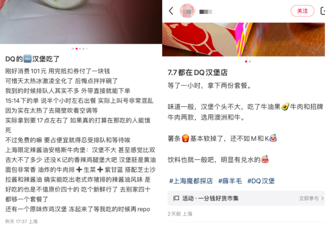 除了高價,DQ漢堡店首批產(chǎn)品也并未給消費者帶來更為卓越的食材品質(zhì)和別具一格的口味體驗。社交媒體平臺上不乏消費者吐槽:DQ漢堡分量較小、味道一般,并不符合其售價,小吃和飲料味道也令人失望。