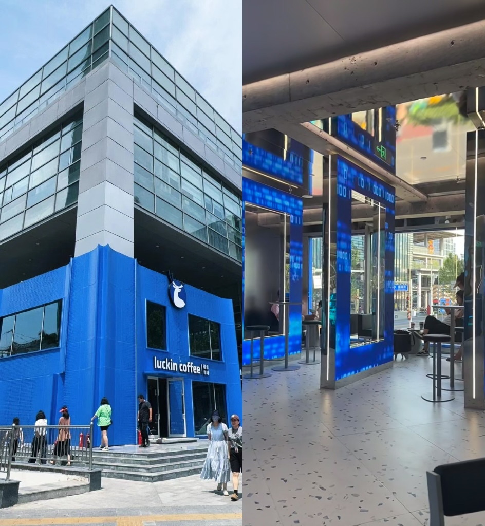 根據(jù)小紅書用戶發(fā)布的圖片來看,該旗艦店是上下兩層,外墻使用鮮亮的藍(lán)色。店內(nèi)放置了超大雕像,并以電子屏取代了傳統(tǒng)隔墻板,且電子屏以藍(lán)色作為底色,顯示“1”“0”組成的數(shù)字代碼,極具未來感。從用戶反饋看,“出片”是該旗艦店的關(guān)鍵詞。據(jù)了解,該門店是北京最大的瑞幸咖啡。
